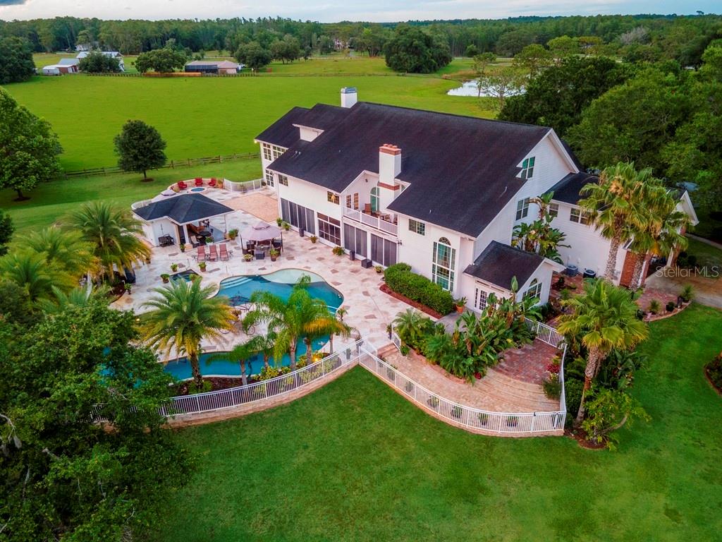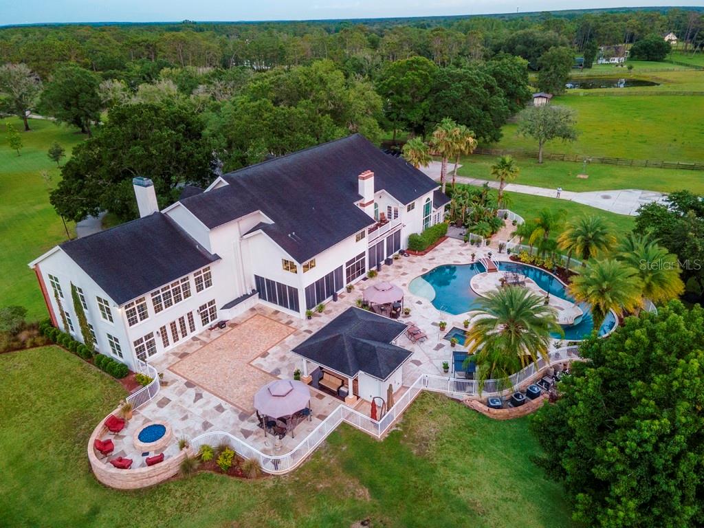 Unique Opportunity! You must experience this property. A stunning 12,268 sq. ft. Tampa Bay custom estate situated on 10-acres of pure pristine countryside. A rare find which has everything including the perfect peaceful location. Custom built and redesigned for perfection this home has everything for the discerning buyer! With a total of 8 bedrooms, including Large Master Suites on floors 1 & 2 both with private sitting areas inside and out, you will find this home has a perfect layout. Also, you will find 7.5 Baths, Elevator, Executive Office, 2 custom Bar/Serving areas on both floors 1 & 2, massive two-story Great Room w/ balcony and remote shades, 1230 sq ft. Apartment with private entry and not to mention your own resort style Lazy River pool.