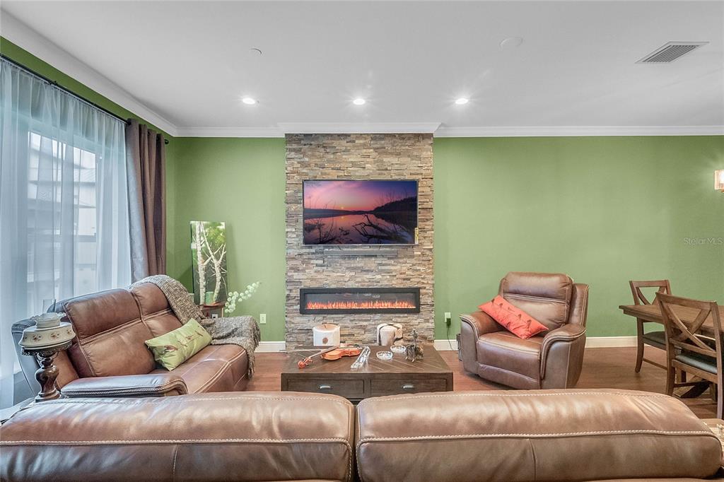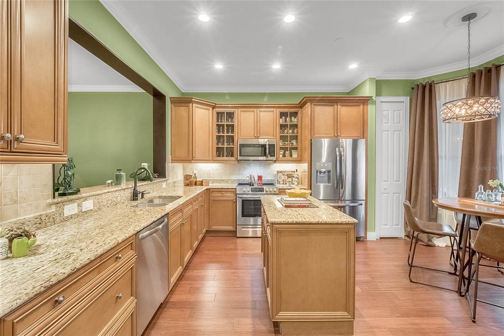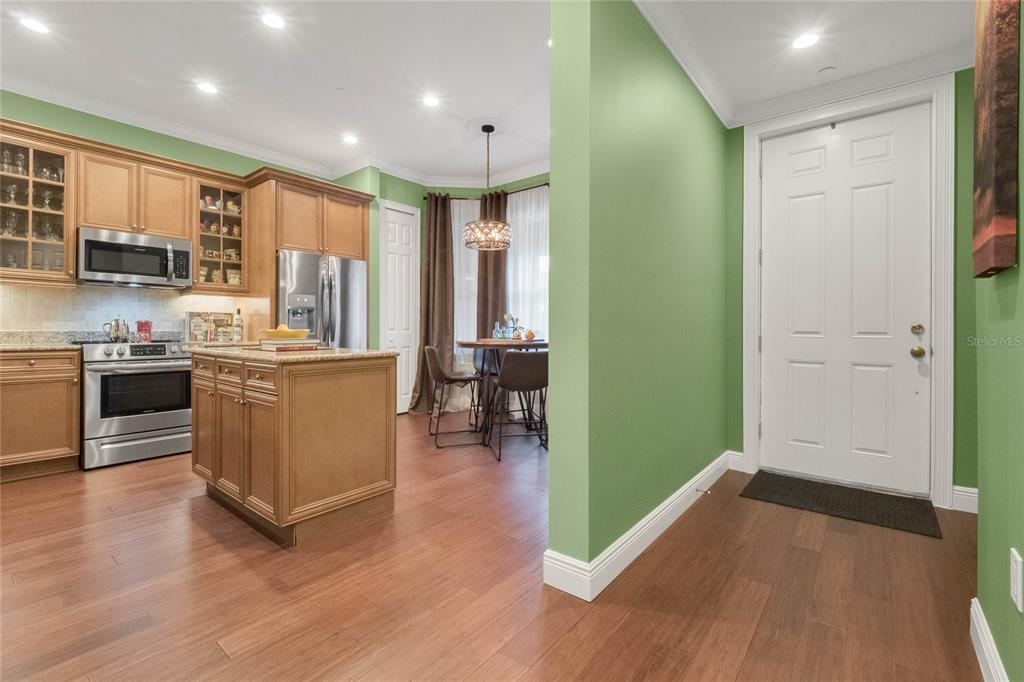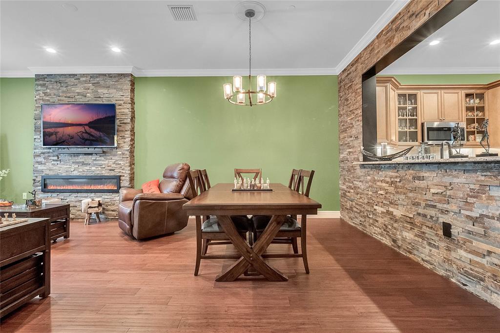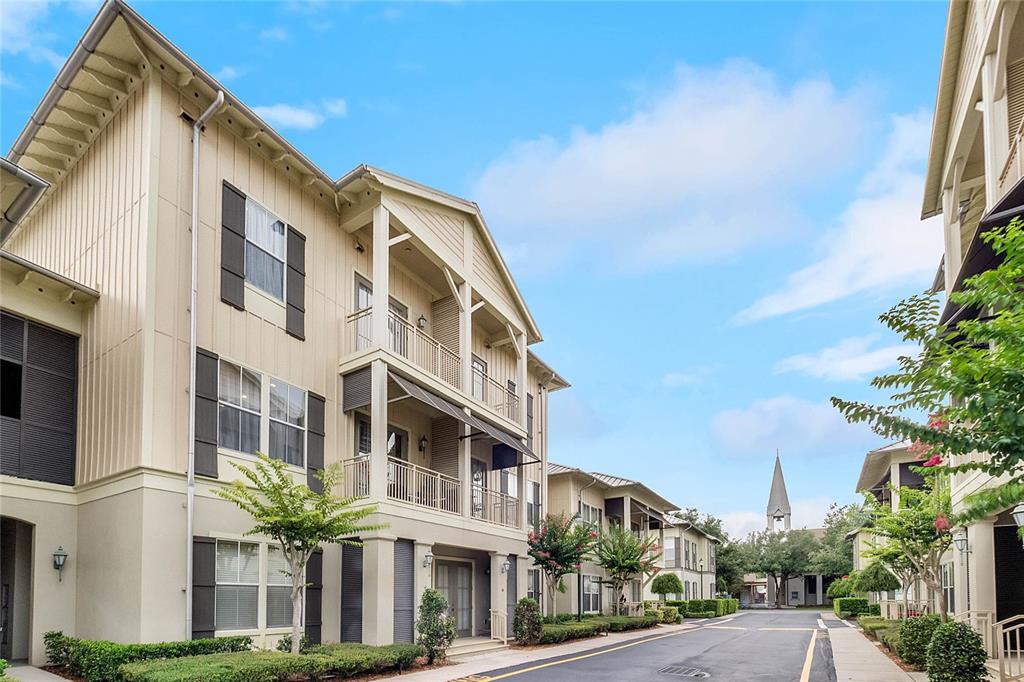Downtown Celebration Residence :3 Bed, 2.5 Bath Exctensivly Remodeled 2-story, 2 private balconies, 1car garage Carlyle condo construction with double glazed windows, 10FT ceiling, 8FT doors and expansive floor plan. Hardwood Flooring with Crown Molding and Smooth Ceiling Finish applied throughout. Masonry work presents unique rock accents in Living/Dining area designed with a comfort in mind and perfect for relaxing. Custom built-in “Fireplace/TV combo wall” . All bedrooms are located upstairs. Spacious Master Suite with French doors opens onto balcony, has a walk in closet with built-in custom cabinets and shelves. Master Bath features a bathtub, dual sinks and a separate shower. Other Features Include: 42″ Maple Wood Kitchen Cabinets, Granite Countertops, kitchen Island plus eat-in kitchen breakfast nook, tankless water heater, LED lightning.